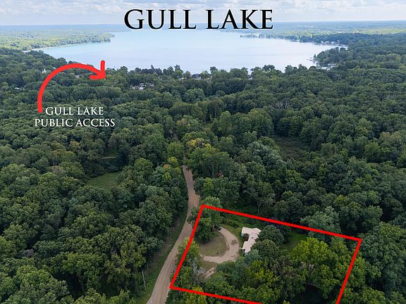 Location, Location, Location! This 3 bedroom, 1.5 bath ranch is just minutes from the Gull Lake Boat Launch/Prairieville Twp Park, where you can spend the day swimming at the beach, picnicking by the water, or launching your boat for endless Gull Lake fun. Nestled on nearly an acre surrounded by mature trees, the home provides a very private setting, with plenty of open space to enjoy outdoor activities, room for gardening, and areas for relaxing or entertaining. A standout feature is the metal roof and the 28x32 pole barn- room for tools, water toys & even an RV. Being sold as-is, this home is full of potential & ready for you to bring your vision to life, creating the project or future home you've been looking for.