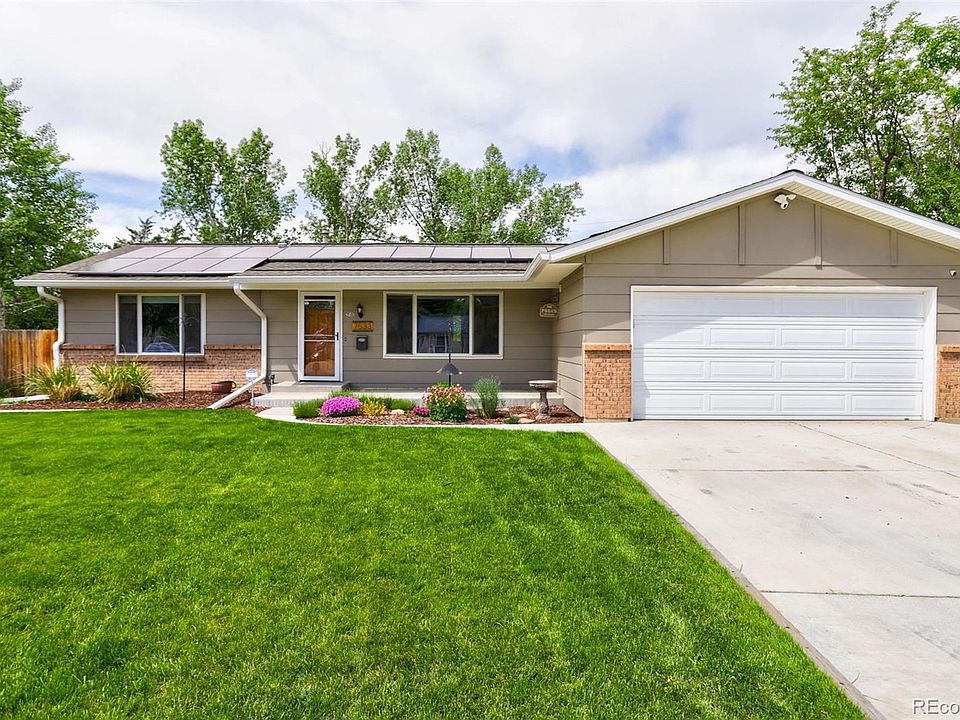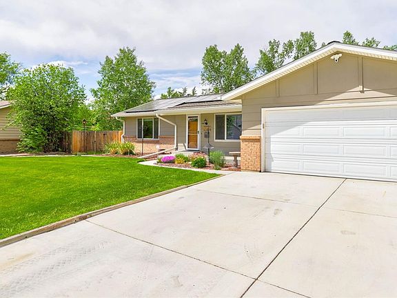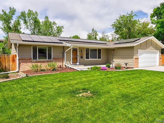 Welcome home to this 4-bed, 2.5-bath ranch on a 10,759 sq ft lot with southern exposure, backing onto Little Dry Creek in Walnut Hills. As you enter, you're greeted by a spacious living room with large windows that fill the space with natural light. Enjoy wood floors throughout and a gas fireplace. The home features the added advantage of owned solar panels, which guarantee low monthly utility costs. The attic has 12 inches of new insulation blown in and a vapor barrier to reduce heat buildup in the summer and keep you warm in the winter. Updates include a newer furnace and AC, a newer roof, gutters, soffit, and fascia. The backyard has undergone extensive landscaping improvements featuring new fencing, two sheds, a sprinkler system, and concrete walkways. Additionally, the property includes a new driveway and garage floor. The main floor boasts updated full and half baths, while the basement has new carpeting. Step outside to the deck and be enveloped by the serene surroundings, providing the ideal setting for outdoor relaxation. Don't miss this great opportunity!