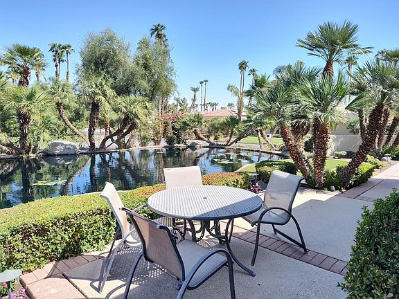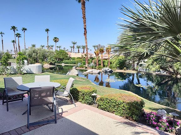 Popular, free-standing Doral plan (over 3,000 square feet) at Desert Horizons CC in prestigious Indian Wells. A great interior location on a corner lot near the end of a cul-de-sac. A peaceful setting located on a lagoon with waterfalls just off the back patio. This 3 bedroom (one used as an office with amazing built-ins), 3 bath home also offers a large bonus room, family room, living room & dining room. The open floor plan is perfect for a casual lifestyle and entertainment. Freshly painted, new carpets and travertine 24'' tiles provide a clean slate for your decorating style. There is a 2-car garage plus golf cart garage. Just steps away from a wonderful community pool & spa.