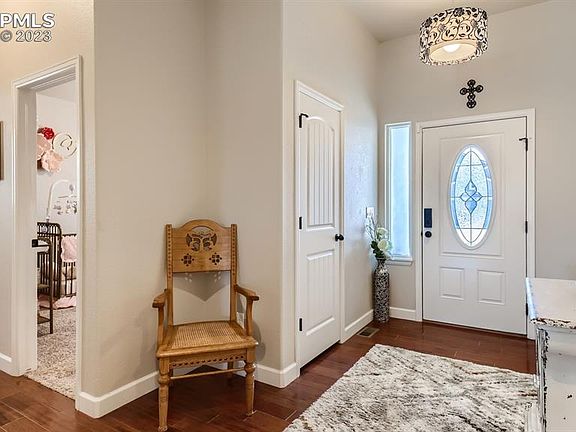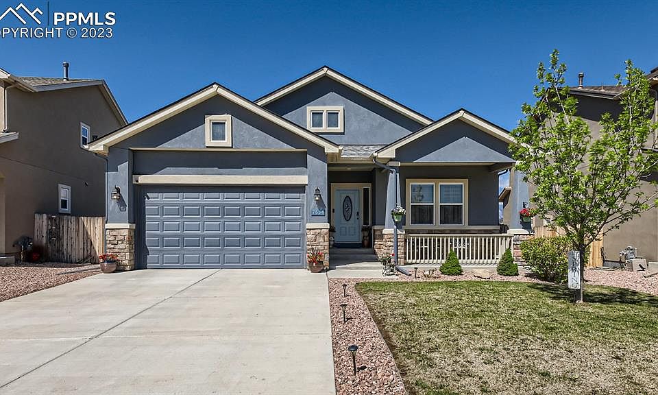 Welcome to a stunning rancher boasting magnificent mountain views in The Glen At Widefield, a prime location just minutes away from Fort Carson, Peterson AFB, and Schriever AFB. This remarkable home offers an open floor plan, panoramic views, efficient A/C, and a gourmet kitchen that will exceed your expectations. The gourmet kitchen is a true highlight, featuring a sizable granite island with a breakfast bar, stainless steel appliances, and an adjacent walk-in pantry for ample storage. The kitchen seamlessly flows into the inviting great room, adorned with vaulted ceilings, beautiful wood floors, and a centerpiece stone fireplace that creates a cozy ambiance. The great room offers wired surround sound and captivating views of Pikes Peak on either side of the fireplace. A haven of privacy, the master suite is tucked away and features a 5-piece master bath and a generously sized walk-in closet. Descending to the lower level, you'll discover a spacious basement with tall ceilings, large windows, a family room, a game area, two additional bedrooms, and a full bathroom. The basement feels anything but typical, providing comfortable living spaces with natural light. Notable features of this nearly new rancher include stucco siding, a 3-car tandem garage, and a convenient laundry/mud room with a built-in bench and cubbies. Step outside to the landscaped backyard, fully fenced and complemented by a covered pergola—an ideal setting for outdoor enjoyment. This home offers a wonderful opportunity to embrace a comfortable lifestyle in a desirable location. Schedule a visit today and let this charming rancher capture your heart.
