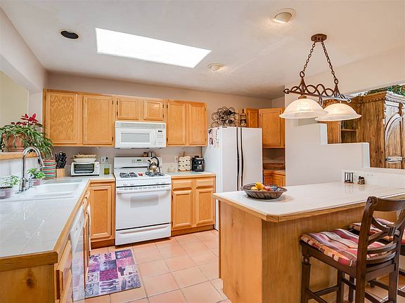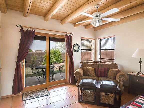 This home is a Santa Fe dream come true! A custom wooden gate welcomes you into the privately walled residence. The property is fully fenced and beautifully landscaped with aspen trees, evergreens, mature trees, grass, gardens, a portal and an outdoor fireplace to enjoy dining and relaxing. There are sunset views from the rear patio which fill the yard with light. The light-filled home features vigas, a kiva fireplace and handmade Mexican tiles. There are two living spaces on either side of the spacious and charming kitchen. On the main level there is also a bathroom and bedroom. Upstairs is the large master bedroom with a wooden deck and a second bedroom and bath. The home was built in 1993 of frame and stucco with 1958 square feet of living space, a two car garage and a laundry room. For your comfort there is radiant heating and a swamp cooler. Located in the gated Vista Primera subdivision. Easy to show and available right now!