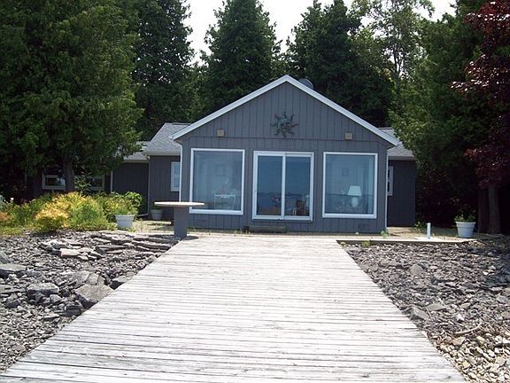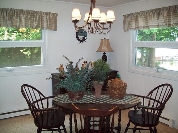 Stunning water and sunset views from this remodeled ranch home with 2+ car garage, sun room with terrific views, PERMANENT DOCK WITH POWER BOAT LIFT, village sewer, and fireplace.