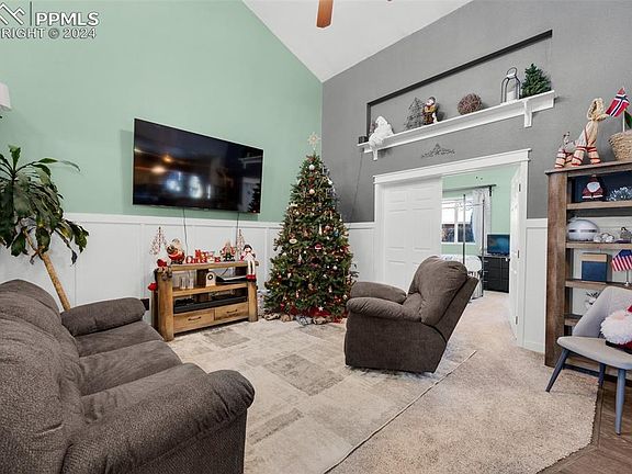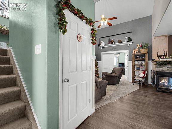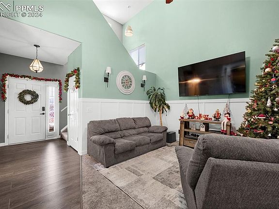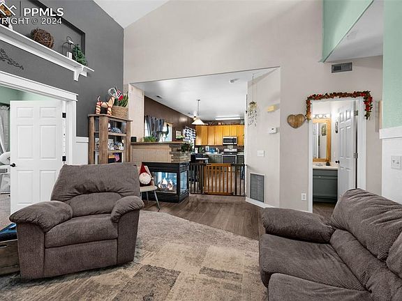 Tucked away in the quiet Countryside West subdivision, this inviting two-story home offers a comfortable and practical layout, perfect for everyday living. With beautifully landscaped front and back yards, the home greets you with curb appeal and a welcoming atmosphere. Step inside to find vaulted ceilings that create a bright and airy atmosphere, complemented by newer carpet and modern laminate flooring throughout the main level. A three-sided fireplace adds a cozy touch, connecting the living area to the formal dining room and kitchen, which features tons of cabinet space and an open feel. A newly added bonus room on the main level includes double doors and offers flexibility as a non-conforming 4th bedroom, home office, or playroom. A half bathroom with a newer toilet and a sizable laundry room completes the main level. Upstairs, you'll find three bedrooms, including the primary suite, which boasts stunning views of Pikes Peak. A stylish barn door leads into the ensuite bathroom with dual sinks and a walk-in closet. The other two bedrooms share a full bathroom. The fully fenced backyard is perfect for relaxation or entertaining, featuring a patio and a dog run. With an attached two-car garage, this home offers the convenience and functionality you need. The active community provides farmers markets during the summer and plenty of outdoor activities. Come see it for yourself!