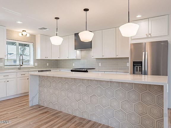 The home also features white shaker cabinets, quartz countertops in the kitchen and bathrooms, wood-look tile flooring, stainless steel appliances, fresh paint, updated baseboards, and all-new lighting fixtures throughout. The landscaping has been completely redone to create a low-maintenance outdoor oasis.