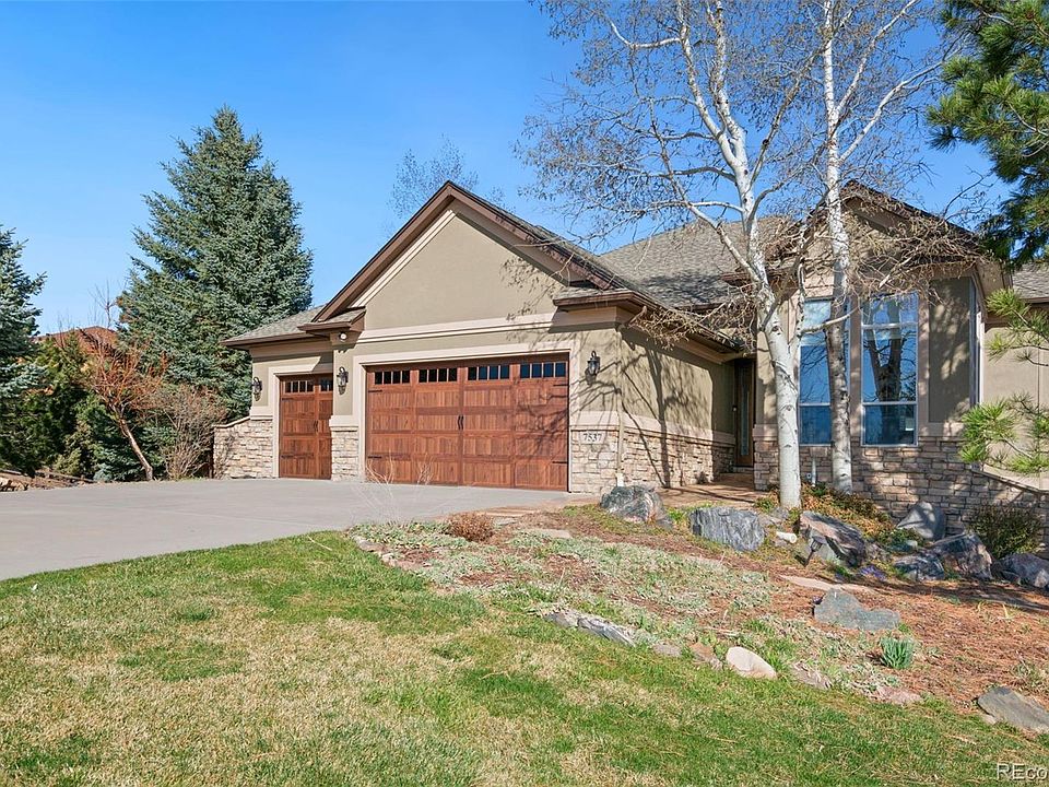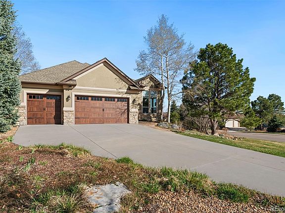 A rare find in a highly sought after neighborhood, this STUNNING ranch home has a perfect location with LARGE LOT and an ideal floorplan. If you are looking to avoid stairs, everything you need is on the main level for ease and convenience. Welcome in through the most gorgeous front door to vaulted ceilings, stone flooring and a focal point drawing your attention to the stone fireplace. Main floor office is cozy and private; the great room means nobody feels left out with flowing openness and the kitchen/breakfast nook/dining room perfect for entertaining. Huge primary bedroom has a gorgeous updated private bathroom and large walk-in closet. The sellers have replaced all South facing windows, updated the appliances, painted the interior, installed new high-end blinds, replaced the central A/C and just had the roof replaced. The walk out basement is fully finished and has 3 large bedrooms including one ensuite perfect for guests or your favorite child:) Big family room with lots of natural light, walkout access and kitchenette wet bar area. Home theatre room is perfect for movie night, all you need is the popcorn. The exterior of this magnificent home is low maintenance stone and stucco with mature landscaping, Seller says just wait until you see it in the summer. Lots of perennials, tons of mature trees and amazing mountain views from this big lot. New sprinkler system installed last summer, front and back. New stamped concrete entry and just wait until you see the back. Covered back deck is a summer dream and you'll spend hours enjoying our Colorado evenings. Quiet, large lot within walking distance of the Colorado Horse Park in a wonderful neighborhood; this home has been lovingly cared for and is a real must see. Quick possession available!