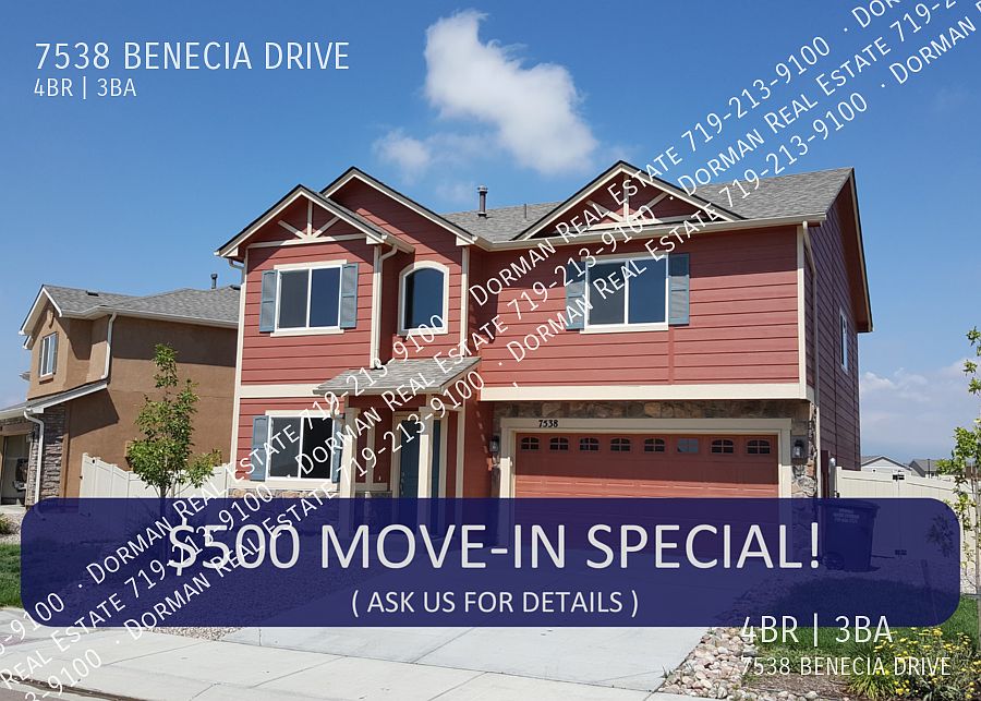 The owner of this property is offering a special incentive of $500 off the first month of rent! Please contact us if you have questions. Beautiful, 2-story home in Fountain. This 4 bed, 3 bath in the Ventana Subdivision is a must see! Open floor plan with lots of light on main. Stainless steel appliances in kitchen. Upstairs master has attached 5-piece bath and walk-in closet. Other 3 bedrooms all have walk-ins, too. Xeriscaped backyard is low maintenance and opens to walking trails right from the gate! Community includes access to pool, fitness center, and playground plus lots of walking trails. Very close to Fort Carson and shopping, dining, and schools. Schedule your showing before it's gone! Please read carefully. Please remove spaces when inputting in your web browser PHOTOGRAPHY/VIDEOGRAPHY DISCLOSURE: We do not take new marketing pictures whenever a rental is turned over between tenants. Therefore, the photos we provide on our listings are meant to help potential residents see the general layout of a property they do not represent the current/actual condition. If you would like to better understand the condition of a listing, please schedule a personal viewing. COLORADO HB23-1099 DISCLOSURE: PROSPECTIVE TENANTS HAVE THE RIGHT TO PROVIDE TO DORMAN A PORTABLE TENANT SCREENING REPORT, AS DEFINED IN SECTION 38-12-902 (2.5), COLORADO REVISED STATUTES; AND IF THE PROSPECTIVE TENANT PROVIDES DORMAN WITH A PORTABLE TENANT SCREENING REPORT, DORMAN IS PROHIBITED FROM: 1) CHARGING THE PROSPECTIVE TENANT A RENTAL APPLICATION FEE OR 2) CHARGING THE PROSPECTIVE TENANT A FEE FOR THE LANDLORD TO ACCESS OR USE THE PORTABLE TENANT SCREENING REPORT. While Dorman does accept compliant portable screening reports as defined by HB23-1099, which would result in no application fee being required (or possibly an application fee refund), we do still require that all tenants complete our application (click APPLY next to any property on our list of properties below). Additionally, you will be deemed qualified (or not) based on the screening information/data provided on our independently pulled report, not based on information/data on your portable report. Please note that bona fide and compliant portable reports MUST come directly from the consumer reporting agency. 2 Pets