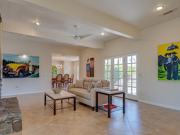 Mid Century Indian Wells Home close to El Paseo with Mountain views 3400 sqft Updated and remodeled, this gated home has a charming yard filled yard with outdoor built in Bar-b-que station for ultimate entertaining around the Pebble Tec pool and covered spa!! The elegant entrance flows through the open floor plan to the Living Room with a Mid Century original stone gas fireplace, Formal Dining Room, large Family Room and remodeled kitchen eat in Kitchen! Large laundry room is adjacent to the kitchen. On the other side of the home you'll find a spacious Master Suite, with its own air conditioning unit, huge walk in closet opening to the pool! This wing of the house includes Powder room and two additional bedrooms. This home has french doors and sliders so the whole home is open to the back yard and feels like your own mini estate! Most windows feature the electric security awnings so it's easy to lock and leave this home for summer. This house has a U shape so most rooms open to the backyard and pool area for ultimate entertaining. The front courtyard provides another private area for indoor outdoor living!