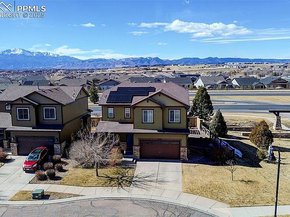 Banning Lewis Stunner!!! This home features a beautiful kitchen with newer appliances, 4 bedrooms, 3 bathrooms, 2 car garage, on a cul de sac with open space to one side, and great views in the sought after Banning Lewis Ranch community! Enter through the front door into the main level with newer wood floors, open concept living room, dining room, and kitchen, perfect for entertaining guests. Kitchen provides generous cabinet storage and counter space. Kitchen also features a large island with beautiful countertops, pantry and stainless steel appliances. Main level also includes gas fireplace, walk out access to the rear yard, and a half bath. Upstairs features all four bedrooms and laundry room on the same level, newer carpet and a nook. Master bedroom includes large walk-in closet and adjoined master bath with dual vanity and shower. Bedrooms 2, 3 and 4 are also on the upper level with plenty of natural light and are very spacious. The unfinished basement provides space to grow. The professionally landscaped backyard is an entertainers paradise with a gorgeous paver patio including a gas fire pit, pergola and great views! Enjoy your summer evenings barbecuing or playing games in the fully fenced rear yard. Home includes newer paid off solar panels. This fabulous home is located in the Banning Lewis Ranch community with amenities galore. Walking distance to school, hiking/biking trails, pools/parks. Community includes pickle ball courts, dog park neighborhood schools, over 65 acres of parks/trails/open space, tennis courts, basketball court, rock climbing parks, zip-lines, access to pools, splash pad, water park, and dog park. Recreation center houses a fitness center and also regularly hosts classes and events for all ages. In the summer months, catch a neighborhood concert, festival, food trucks, farmers market or enjoy other regular community events. This community has it all.