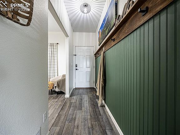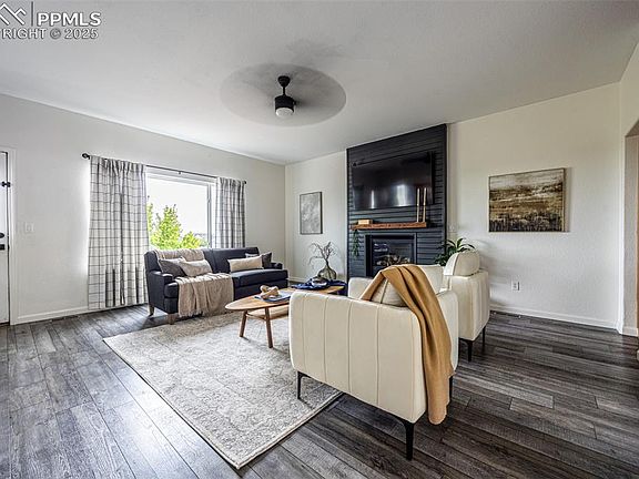 Welcome home to this spacious and versatile two-story beauty, designed for comfort and convenience in every corner. Want utility free living? The 2023 solar panels got you covered! From the curb, you'll appreciate the low-maintenance landscaping and extended driveway—perfect for extra parking or visiting guests. A cozy front porch sets the tone for warm welcomes and morning coffees. Step inside to a flexible front room ideal for a home office, playroom, or formal dining—tailored to your lifestyle. Rich wood flooring flows seamlessly through the main level, guiding you to an open-concept kitchen and dining area. The kitchen features sleek stainless steel appliances, upgraded laminate countertops, and a glass-top range, with laundry and a half bath tucked nearby for added ease. The living room offers a generous gathering space, centered around a gas fireplace and filled with natural light. The back door leads you to a spacious 22x11 pavestone patio—your private outdoor retreat with open views and an unbeatable peek at Pikes Peak. Upstairs, you’ll find four well-sized bedrooms, including a massive primary suite with a luxurious five-piece bath and walk-in closet. A full hallway bath serves the additional bedrooms. Downstairs, the mostly finished basement expands your possibilities with a large family room already complete. Framing is in place for a potential fifth bedroom and extra bathroom, giving the next owner a head start on even more space. A large unfinished area provides excellent storage or could be transformed into a home gym, craft room, or second office. Located in a highly accessible neighborhood with quick routes to Powers, Marksheffel, and nearby military bases, plus endless shopping and dining options just minutes away—this home delivers both peace and practicality. Don’t miss the chance to make it yours!