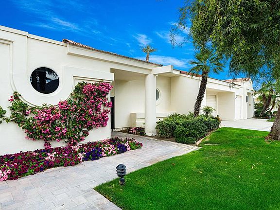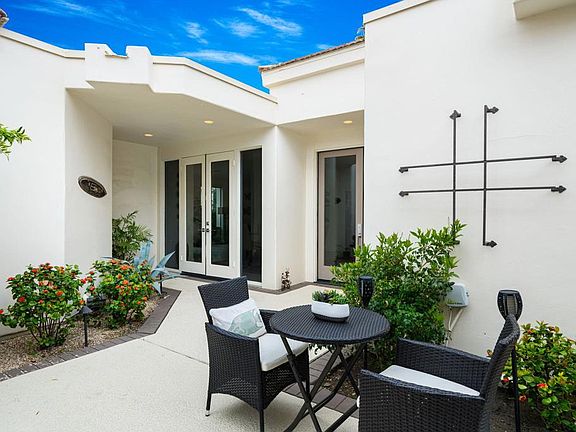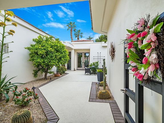 A beautifully redone home in a great location. It's move-in ready with much of the furniture included. Bright and airy with abundant windows, the home has 3 bedrooms and 3 baths (1 bedroom and bath is in the apartment-like casita). Consistent with our desert lifestyle, you enter through an enclosed landscaped courtyard with seating for casual chats or morning coffee. Walk through the front door into a grand open space with separate areas for kitchen, formal dining, living room, family room and a full bar. All with elegant, modern finishes and fixtures. Walk out onto the large back patio that offers both casual seating and outdoor dining. Located on the 18th fairway, the patio offers tremendous views of the golf course, surrounding mountains, and the 18th hole lake. The entire house has been redone including tile flooring throughout, upgraded bathrooms and fixtures, kitchen and appliances. ***SOLAR OWNED***