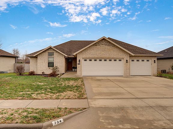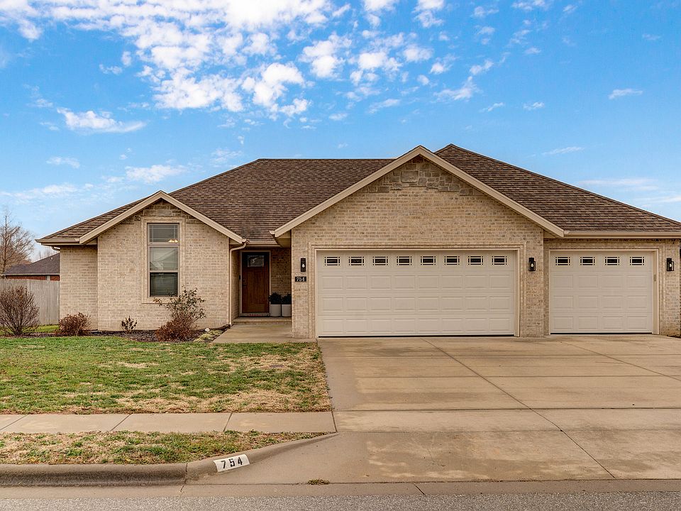 Like-new 2019 home located in the Ozark North school district, offering exceptional curb appeal with a brick and stone front exterior, attractive landscaping, and a full irrigation system for easy maintenance. Step inside to a spacious living area featuring beautiful hardwood floors and a cozy corner fireplace, all within a thoughtfully designed split-bedroom floor plan that includes a private primary suite and three additional nicely sized bedrooms.The open-concept layout seamlessly connects the living, kitchen, and dining areas--ideal for both everyday living and entertaining. The eat-in kitchen offers island seating, a large pantry closet, and a dedicated dining nook that opens directly to the back deck, overlooking a fully fenced backyard--perfect for relaxing, play, or pets. Warm, modern interior tones (not stark white) create a welcoming, contemporary feel, and all kitchen appliances, including the refrigerator, are included.A driveway leads to a spacious three-car garage, adding everyday convenience and ample storage. Well maintained, thoughtfully designed, and truly move-in ready--this home checks all the boxes.