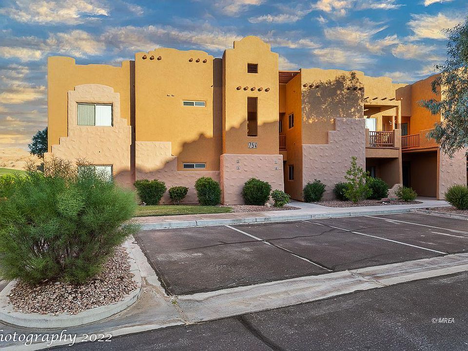Don't miss out on 754 Hardy Way #B! This condo has a fantastic location! Right next to parking, just steps away from the pool and hot tub area, and right on the golf course Fairway-Lake-Green!! The views from the patio and the Main Bedroom are some of the best, offering sights right over the lake to the #8 Hole at the Palmer Course Fairway and Green, with the backdrop of natural desert bluffs and Virgin Mountains. Sunrises here are unmatched and because the patio faces East, you benefit with shaded patio sunsets. Awesome layout, offering separated living quarters with a cozy living room in between. Kitchen offers plenty of cabinets and counter top space and even a dining area. No need to worry about stairs, this is a main level condo!