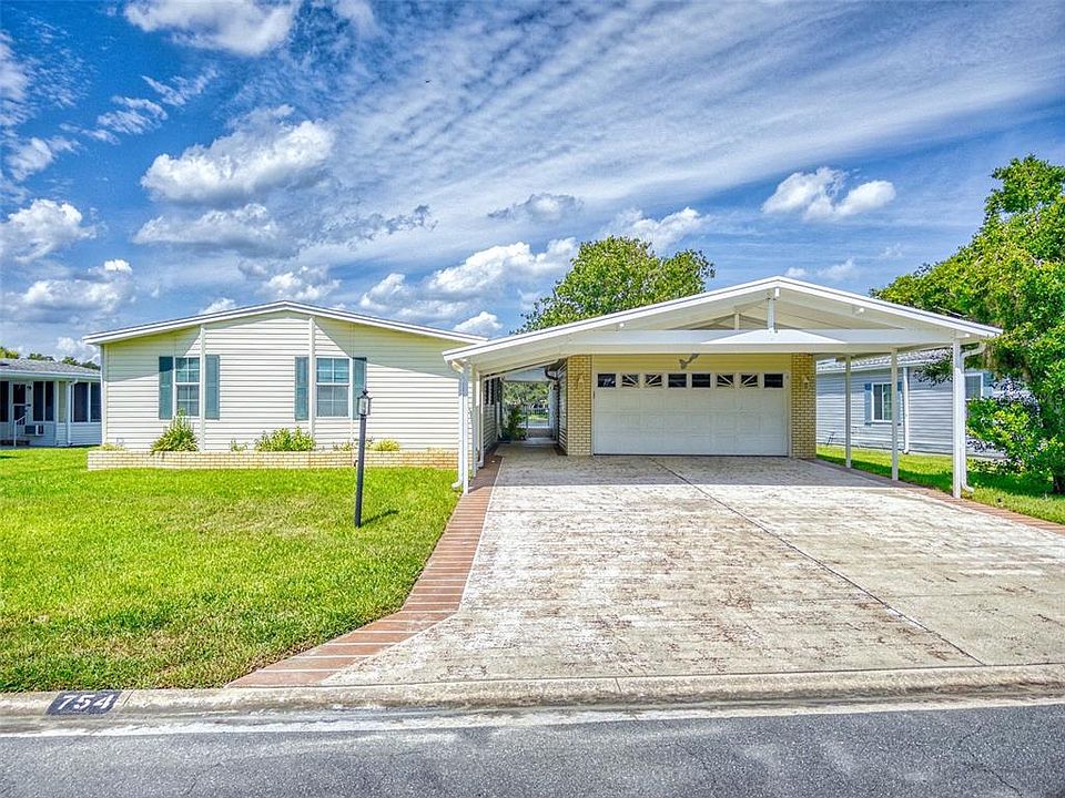 This is a WOW house! Starting with the painted driveway with 2 car garage and 2 car driveway plus carport. 2 BR immaculate completely furnished home has a large glassed florida room looking out to the lake with a patio on the side. Living room, dining room, eat-in kitchen and island kitchen all have views. Lots of storage areas. Must see! A/C 2021 with warranty, roof 8/17 and hot water heater 5/30/13. Edgewater Landing has many activities including resident intracoastal boat ramp. Heated pool, spa, exercise room, pickleball, tennis, bocci, shuffleboard, fishing dock, a mile long walking path. Residents are allowed either an outside boat storage area or RV as available. HOA dues include high speed internet and Platinum level Spectrum cable. Community is close to shopping and the beach. Resort living every day. Probate must be completed before closing.