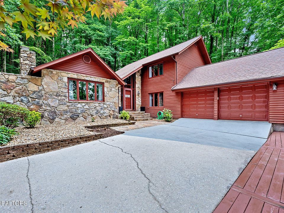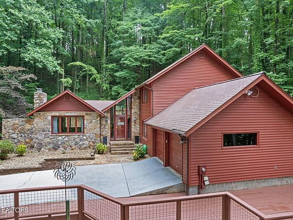 Welcome to 754 Poplar Creek Rd, a captivating chalet style home nestled on 2.63 acres in Oliver Springs, TN. This 3-bedroom, 2.5-bathroom residence combines rustic charm with modern amenities, offering breathtaking views of the Cumberlands and a secluded, peaceful setting just 20 minutes from the heart of Oak Ridge. Multiple entertaining areas whether from the back on the gorgeous paver patio or from the front with the newly expanded deck! The eat-in kitchen features granite countertops, stainless steel appliances, and ample cabinet space with pull out drawers, complemented by a formal dining room. HVAC system replaced in 2023 and new flooring throughout most of the home ensure modern comfort and style. Not to mention new closet doors, paint, & light fixtures. The family room boasts a stunning cathedral ceiling, fireplace, large windows, & access to the patio. Upstairs is the master bedroom with bathroom & walk-in closet, two additional bedrooms & another bathroom. Optional neighborhood pool membership available for added recreation and enjoyment. Don't miss the opportunity to own this charming chalet with its incredible views and modern updates. Schedule a showing today to experience the unique blend of tranquility and convenience. This home is truly a gem and won't last long! Professional photos coming June 4.