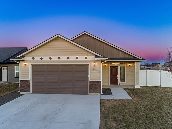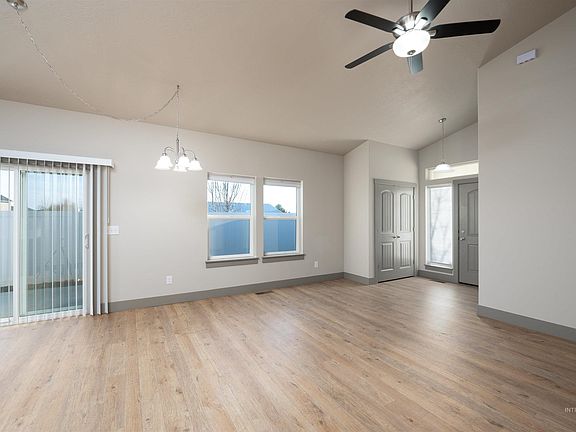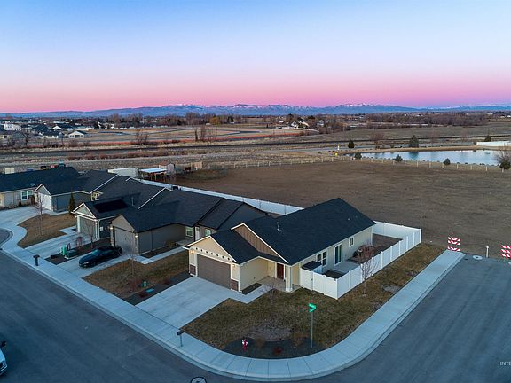 Charming single level, split bedroom design home. Open floor plan with vaulted ceilings and vinyl flooring throughout except bedrooms. Kitchen features breakfast bar/island, stainless steel appliances, subway tile backsplash and pantry. Primary suite features 2 sinks, soaker tub, separate shower and walk in closet. Updated interior paint and blinds. Great corner lot with no rear or side neighbor with views. Fully fenced lot with auto sprinklers. Small neighborhood near downtown Kuna.