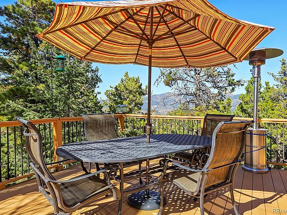 Welcome to this beautiful home with truly incredible views. You will enjoy ideal and convenient living with a welcoming front porch, a fabulous deck, and stunning vistas from almost every window. The home is in excellent condition, with great curb appeal and a layout that flows effortlessly from room to room. The vaulted ceilings and large windows make for a light and bright living room, all open to the expansive kitchen. The inviting kitchen features a big pantry, breakfast bar and wonderful casual dining area with access to the deck. And the deck is amazing – you will live ¾ of the year here on this huge composite deck with lighting and large outdoor living area, all perfect for entertaining and fabulous parties. Or spend time soaking up the views, sunsets, sunrises, or the moon above. It also makes a great outdoor office! Upstairs find the primary suite and two additional bedrooms and bath. The primary suite is a true oasis, featuring vaulted ceilings, fireplace and grand views of white capped peaks. The primary bathroom has dual sinks and ample walk-in closet and a jetted tub with more stunning views. An incredible place to relax! Situated on a private 3.9 acre lot, the property has lovely landscaping, aspens and pine offering plenty of space and seclusion. The newly resurfaced paved driveway and oversized garage are ideal, and all roads are paved. Rest easy on your mitigated property and newer Class 4 roof. It's just .6 of a mile to open space and miles of hiking, biking & cross country ski trails. Convenience is yours too, as its only 5 minutes to I-70 for an easy commute to Denver, just 50 min to skiing, and only 10 minutes to Evergreen & all amenities. Low Clear Creek County taxes too! Enjoy this beautifully maintained home with incredible views, a convenient location, privacy and a great layout – mountain living and convenience come together seamlessly! See more photos, video, 3D & floor plan at www.754SaddleRidgeDrive.com Some rooms virtually staged.