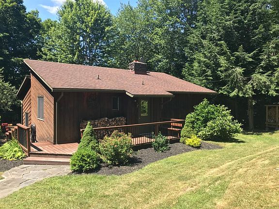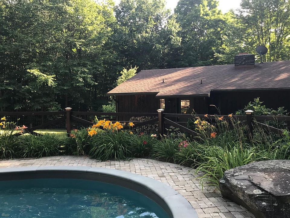THE COMPLETE PACKAGE FOR THE PERFECT ESCAPE!! How amazing would it be to arrive at this lush, private, peaceful setting where there are no neighbors to be seen, be able to unwind by the INGROUND HEATED POOL, or enjoy a glass of wine on the deck while relaxing to the sounds of nature and the sun peeking playfully through the trees? This three-bedroom, two-bath getaway is just what you have been dreaming of! Breathe deeply in the OPEN FLOOR PLAN lined with with LOTS OF WINDOWS and an expansive CATHEDRAL CEILING. The WOOD BURNING FIREPLACE cozies everything up when the weather turns colder. Upstairs, the MAIN BEDROOM IS EN SUITE, and second bedroom is across the hall. Downstairs off the living room is ANOTHER VERY POSSIBLE BEDROOM, now being utilized as a den and a place to comfortably harbor guests. The INGROUND HEATED POOL is bordered with beautifully designed ROCK WALL GARDENS, and surrounded by pavers. At one end is a GREAT CABANA, outfitted with speakers so you can hear your favorite tunes in sun or shade! The entertainment possibilities expand to the DECK in the back of the house, with a lovely long view of the yard and more rock walls. Easy access to the house and the kitchen island is through the sliders. The property beyond the yard is wooded and waiting for your inspiration! This home isunder ten minutes to skiing, hiking, paddling, villages, fabulous restaurants and more, because the Catskills have a lot more to show you. Come have a look!