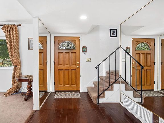 Bright, two-story home with an attached two-car garage and a spacious floor plan. Enter to formal living and dining rooms that lead to the modern kitchen, which boasts rich cabinetry, quartz countertops, and breakfast counter seating that opens to the family room with a cozy fireplace. A bonus office/room that overlooks the pool. All bedrooms are upstairs including the large primary suite with its own en-suite bath with dual sinks, a walk-in shower, and a walk-in closet. Enjoy breathtaking views from the balcony, which overlooks the surrounding mountains, with Mission Trails at one end and Cowles Mountain at the other. Outdoor living extends to a private low-maintenance backyard that features a pool and covered patio, making it perfect for entertaining. Solar system to help cut down utility costs. Great school district, that includes Patrick Henry High School. Located close to the best San Carlos has to offer, including shopping, dining, parks, Lake Murray, Cowles Mountain, Mission Trails, Interstates 8, and 125, this home combines comfort and convenience in a prime location.