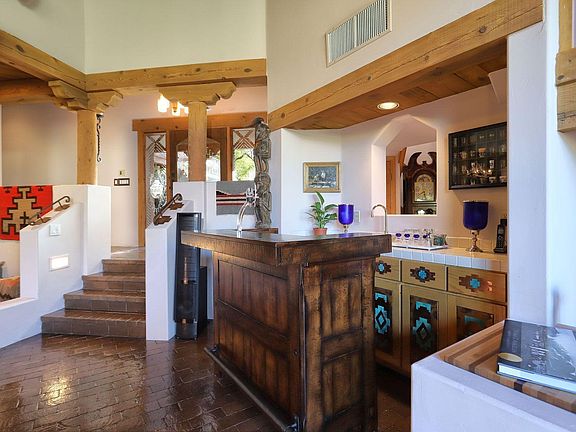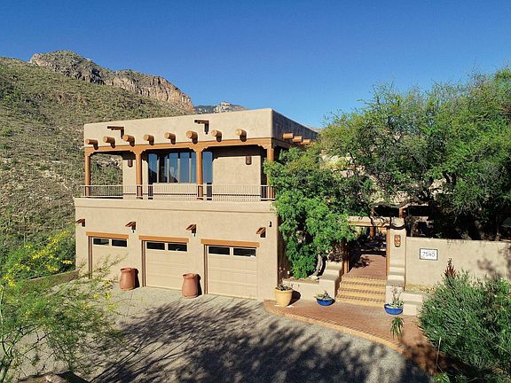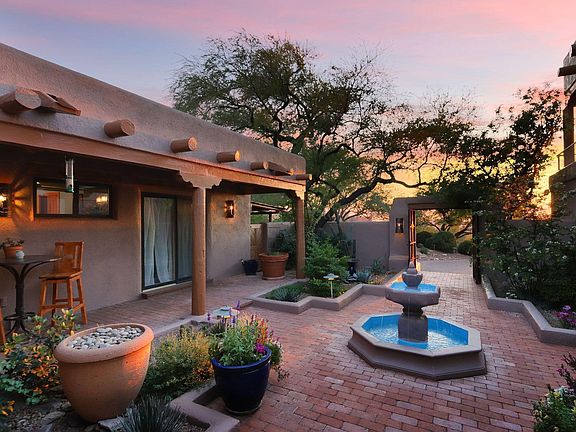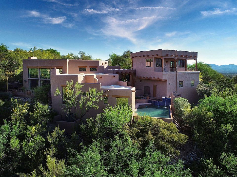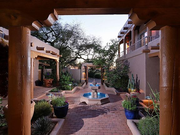 Imagine coming home to a magnificent piece of pure Santa Fe style architectural and cultural living history! This unique home in the guard-gated community of Sin Vacas in the Catalina Foothills offers a rustic, yet regal lifestyle. The premium hill-side lot allows for breathtaking picturesque views of the ancient desert, and its mountain ranges are easily visible from the home's many over-sized windows and outdoor living spaces. The Old-World appeal of this property begins with its entry into a walled Courtyard, featuring a multi-tiered fountain. The wrap-around covered patio invites you down to a spa with a cascading water feature spilling into the negative edge heated pool, all over-looking the endless natural desert landscape generously dotted with mature healthy saguaros, desert acacia and palo verde trees. The spacious Great Room boasts a soaring 16-foot high wood viga beamed ceiling. The corbels, log pole accents, and brick flooring provide a natural relationship to the outdoor terrain. The massive wood-burning fireplace is situated near the window-wall, offering incredible views of the majestic mountains and ancient desert flora and fauna. A second, private, kiva fireplace is located on the opposite end of this huge space, in an intimate sunken banco sitting area making it a perfect spot for gentle conversation. A Library Loft overlooks the massive Great Room, and offers a cozy space for reading, re-energizing, or just a fun place for kids to hang out. A Formal Dining Room is linked to the Great Room, with another kiva fireplace and a round dining table lit by a grand antler chandelier. A Farm-to-Table Kitchen is represented in this authentic Arizona kitchen, offering plenty of space for the chef along with a protected trellised atrium to grow herbs and vegetables. The kitchen features a Sub Zero refrigerator, Wolf 48" dual fuel range with 6 gas burners, Bosch dishwasher, 182 bottle wine cellar, and doors leading to the inner courtyard with its natural floral fragrances. The Master Suite is the epitome of the Southwestern lifestyle, emanating serene, natural energy. It includes a corner beehive fireplace, wooden viga ceiling, window wall with unobstructed views of the ancient Catalina Mountains, and glass doors leading to the pool, spa, and courtyard. A double-sized Guest Bedroom Suite includes a living area opening to the atrium. The large Casita is equipped with its own kitchenette, and features an awe inspiring wraparound deck with 360 degree mountain and city views. Perhaps these pristine scenes will inspire you. Nature at it's finest. By day, night or anytime in between, this one-of-a-kind home is at one with the great outdoors! You'll love the four verandas with their flower and cactus gardens, along with a large three car garage. If wildlife viewing is your thing, or you enjoy stargazing Tucson's "dark skies," this is the perfect setting for relaxing in the spa or enjoying your telescope's personal light show.