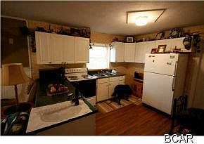 Exterior Features:This house is on a 0.4 acre lot. Curb appeal is fair, grass is patchy. Nice sized front porch area by main entrance. Siding is wood and in fair to poor condition. Roof is asphalt type in fair to poor condition. Unpaved driveway leading to property for parking. Interior Features:This is a 3 bed 2 bath house with 1,008 sq ft. Flooring is hardwood, carpet, and tile and in fair condition. The kitchen is in great condition, nice countertops and cabinets. Missing all appliances.