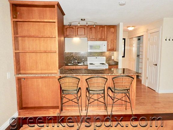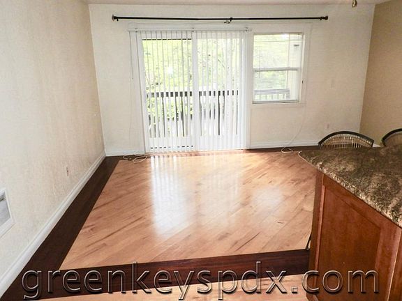 This renovated condo has gleaming hardwood floors framed with Brazillian cherry, granite counters in kitchen, granite floors in bathroom, new cabinets. It's in a peaceful, wooded setting. Sliding glass doors lead onto a balcony with a treed, sunset view. Plenty of closet space. This studio condo has 416 square feet of space and free parking under a carport. Rent includes water, sewer, garbage collection, and access to the swimming pool, whirlpool, sauna, fitness center, clubhouse with free wireless Internet and 3 tennis courts. Available immediately. Low utility bills (only $30 to $80 a month, depending on season). Comes with a window air conditioner for use in summer. Rent covers access to Sylvan Heights swimming pool, hot tub, sauna, fitness center and clubhouse with free WIFI. (Tenants apply for a photo ID pass once lease is signed) Utilities: Owner pays for garbage, water and sewer. Tenant pays electric bill. There is no gas bill. Laundry: Laundry facilities (2 washers and 2 dryers) are located down the steps in the same building. You use a laundry card to turn on the machines, and you reload the card in the basement of the clubhouse using a credit or debit card. Location: Just minutes to downtown -- drive downhill on Burnside into the center of the city. This condo is part of the wonderful Sylvan Heights Condominiums community, which is near Starbucks, grocery stores, restaurants, St. Vincent's Hospital, Catlin Gabel School and the MAX Sunset Transit Center. Hop on 26 or 217 to get just about anywhere. It is close to Forest Park so you can walk or jog along the trails in the largest forested park in the nation within city limits--5400 acres with more than 50 miles of hiking and biking trails. You'll also be near the Oregon Zoo, Hoyt Arboretum and the rose gardens of Washington Park. Directions from Downtown Portland: Take Burnside up the hill until it becomes Barnes Road. Due to construction, the main entrance of Sylvan Heights is currently closed. Follow the detour by going through Sunset Heights first, then downhill into Sylvan Heights. You will enter Sunset Heights at the intersection of SW Barnes and SW Miller. As you roll downhill into Sylvan Heights, follow the signs to find building 7540. Go down the central staircase to door G. Call Gail for directions from that point. Move-in costs: First month's rent plus security deposit. Application fee: $45 per applicant age 18 and up. No pets except one cat. If you have a cat, the pet rent is an additional $30 per month. Print out this flyer and keep it handy. IMPORTANT: This is a studio condo, not a one-bedroom. Please don't call if you are looking for a one-bedroom! Thanks. Owner pays for garbage, water and sewer. Tenant pays electric bill. There is no gas bill. Move-in ready. Preference given to applicant who wants to move in sooner rather than later.