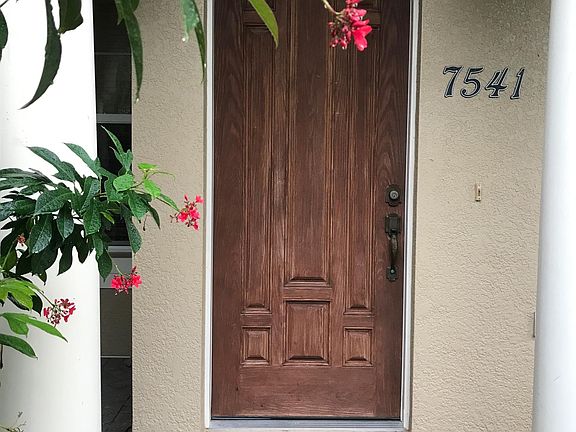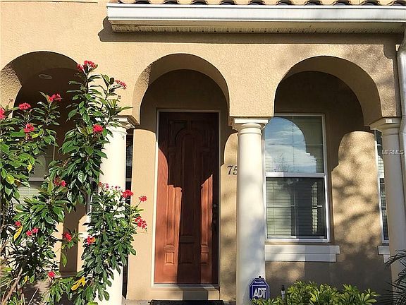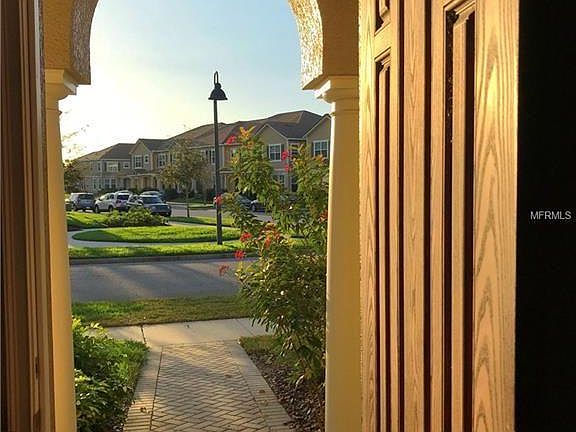 Unique Mediterranean Style Luxury Townhouse with Double Master Suites. One of 10 Luxury Townhouses built by a custom builder with ATTACHED GARAGEs directly accessing the entrance. The Laundry and Pantry Room has built in Cabinets and a Storage Closet to facilitate grocery shopping. Upgrades include bamboo flooring, Crown Moldings on the 10 ft. Ceiling and 8 In. floorboards. Beautiful granite counters in bathrooms and kitchen also enhance the spacious lunch counter island . 42 in. custom wood cabinets with Crown Molding . Gourmet stove with two ovens (one is a Convection oven!), as well as Stainless Steel Appliances. Surround sound system w speakers. All on first floor overlooking a garden. Spacious upstairs bedrooms with custom closets include an adjoining tiled and covered balcony, with a wrought iron banister to sun yourself by day and view the Disney Fireworks nightly. Owner pays for trash, lawn service, HOA