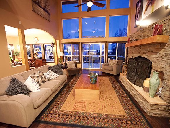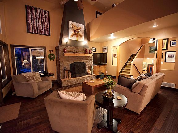 Enter this gorgeous home thru Frank Lloyd Wright like doors. Spacious entry, tile floor. Down is a MIL w/kitchen & washer/dryer or use as a theater room w/bar. Hardwood stairs lead up to a living room overlooking beautiful city lights and panoramic views of the mountains. LR is wired for sound. Wood stove insert that can heat the entire house w/temperature control. Ext is Venetian plaster. finish.
