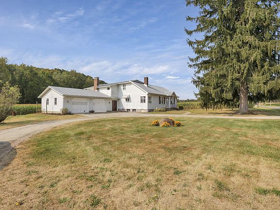 Welcome to your country retreat! This 4-bedroom, 2-full-bath home blends charm with functionality. The original portion of this home features hardwood floors, beautiful woodwork, and an original built-in, while the 21x19 family room offers solid wood paneling and a wood-burning fireplace (w/ blowers). Two bedrooms and one bath are conveniently located on the first floor. The oversized 30x27 garage includes a separate staircase to the large usable basement (over 1300 SF), providing excellent storage and workshop options. Dual HVAC systems add efficiency: a propane heat pump serves the upstairs and family room, while a fuel-oil system (with tank in garage) heats the original section of the home. metal roof. Outdoors, enjoy the country setting from a large back porch and a partially fenced yard—perfect for pets, gatherings, or quiet relaxation.