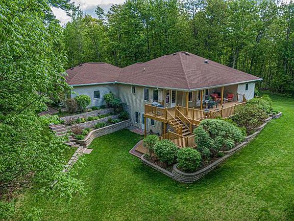 This 3 bedroom 3 1/2 bath home, built with quality in mind features an attached 3 car 26 x 36 garage, 3200 sq. ft. of living space & 5.8 acres of wooded privacy. The kitchen is a focal point with abundant maple cabinets, island with gas stove top, double ovens, stainless steel appliances, under cabinet lighting, & a breakfast nook with windows. There is main floor laundry, 1/2 bath, & pantry close by. The living room enjoys a gas fireplace & enjoys the backyard view with the formal dining room. The back deck is 40 x 20 ft is partly covered with ceiling fan. The master bedroom suite features a spacious master bathroom with separate jet tub & shower, & 2 walk in closets. There are 2 more bedrooms & a full bath on main floor. The walk out lower level is finished off like an efficiency style apartment & includes a kitchen, pellet stove, full bath, perfect for entertaining. There are raised gardens, apple trees, raspberries, garden shed, extensive landscaping, & lighted driveway.