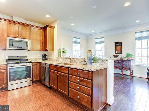 Gorgeous end-unit home in the desirable Maple Lawn community impresses with high-end finishes and low maintenance living at its finest! Fall in love with the hardwood flooring throughout, high ceilings, intricate crown molding, and smart features including the front door lock, doorbell, and thermostat. Prepare gourmet meals in the kitchen appointed with 42-inch soft close cabinetry, granite counters, stainless steel appliances, and breakfast bar. Adjacent open concept living and dining rooms are ideal for entertaining and everyday living. Entry level bedroom and en-suite bath is perfect as a guest suite or home office. Primary bedroom highlights a walk-in closet and an en-suite bath with a large shower and double vanity with quartz counters. A second generously sized bedroom, full bath, and laundry room conclude the interior this lovely home. Rear loading 1-car garage. Convenient to US-29, I-95, MD-32, as well a multitude of shopping and dining options.