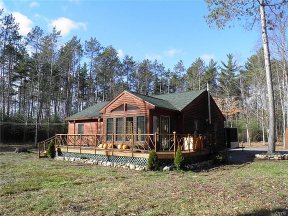 Outdoor enthusiasts will love this warm, ~1,200 sf, 2-bedroom, 2 bath, ranch style home located on a 52-acre wooded lot bordering Miller Brook, just inside the Adirondack State Park. Built just 9 years ago in 2011, it is characterized by all the modern standards of energy efficiency including; windows, doors, insulating components and appliances. The cedar sided house with wrap around porch, attached 2 stall garage and 3 outbuildings was constructed for privacy, with ~500' of dense woods between it and the public road. Interior features include an open floor concept living room and kitchen with cathedral ceiling, T & G pine walls, ceilings and floors throughout with the exception of wall to wall carpet in the bedrooms and ceramic tile floors in the bathrooms, sun room and utility room. A propane furnace includes both heating and cooling functions and the living room woodstove compliments the warmth and comfort of the home during the colder months. Kitchen and laundry appliances stay. Private drilled well and modern septic system. Buried utility lines minimize outages. Miller Brook trout stream is considered the jewel of the property. Close to snowmobile C8C and ATV trails