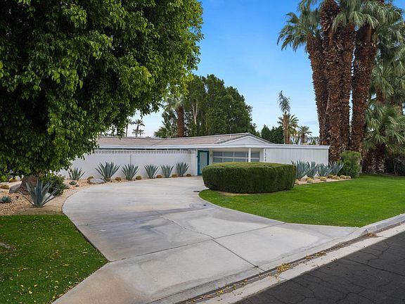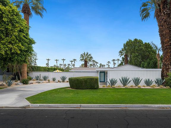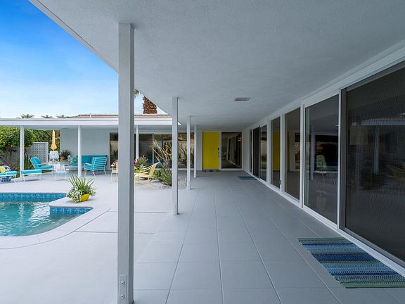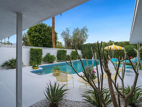 No details were spared when this stunning Mid-Century home was redesigned. The grounds are lush and inviting from the time you drive up to the property. Once you enter the turquoise door it's like you've arrived at an iconic boutique hotel. A long wall of floor to ceiling windows emphasize the dramatic breezeway that leads to the front door. Before entering you are captured by beautiful mountain views and the oversized sparkling pool & lounge area with mature citrus trees & deco breeze block wall. The interior has classic 24X24 polished white tile throughout, wall paper accents, timeless light fixtures & hardware. The two bathrooms have newer floating cabinetry with countertop basins and original shower surrounds that have been restored paying tribute to the 1960's. Both bedrooms are large, the Primary has a walk-in closet and floor to ceiling windows that take advantage of the South Mountain Views while the secondary has a slider that leads you to a delightful sitting area. The fabulous kitchen displays a mixture of metals, floating shelves, quartz countertops with full tiled backsplash, custom hood and a U-Line range. This property is located in the desirable non-gated community of Rancho Palmeras Estates, adjacent to El Dorado and the Vintage Clubs, in South Indian Wells. Property is being sold fully furnished.