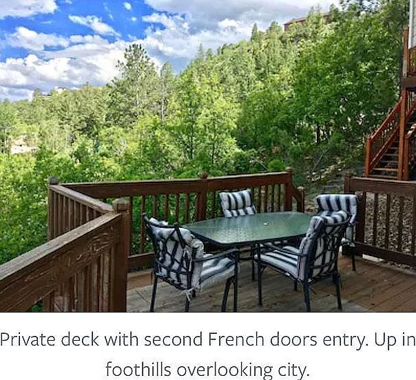 10 MINUTES TO AIR FORCE ACADEMY. FULLY FURNISHED, UTILITIES INCLUDED. FLEXIBLE LEASE FOR THOSE NEEDING SHORT-TERM HOUSING. (See notes below.) Set in Foothills of Colorado Springs, upscale, very SAFE, quiet neighborhood. 1300 sq ft furnished property on a quiet cul-de-sac less than 10 minutes from US Air Force Academy. MAXIMUM 2 persons. Your two separate entrances assure privacy in this gorgeous, spacious, and well lighted furnished apartment in the lower level of our 3-story home. (Note: We are very quiet and travel often so you won't hear much from us.) Living room w/big screen tv for movies, ROKU & Netflix; antennae picks up several local channels, office space with desk and FREE WIFI. Single bedroom with queen pillow-top bed. Bathroom has large walk-in steam shower and a separate soaker tub w/shower. Kitchenette includes double burners, 2 small refrigerators, microwave, toaster oven, coffee maker, toaster, crockpot, and dish-ware/utensils. You also have access to full size freezer. Housekeeping services are available for additional fee. Private deck with stunning views overlooking Colorado Springs below to the east. Front Range of Rocky Mountains are to the west. Lots of windows for natural sunlight but heavy darkening shades perfect for those who work nights. Note: Terms are minimum 3 months, then month to month after with 30-day written notice of move out. Deposit, cleaning/disinfecting fee and first month rent due to secure booking. 100% refund if canceled within 48 hours of booking. Deposit fully refundable depending upon condition of property at check out. No other refunds are approved. Strict No Pet and No Smoking policies. No exceptions. FLEXIBLE LEASE TERMS. Ideal for traveling medical professionals, temporary business assignments, couples building their first home or looking for a home in the area...or anyone needing short-term rental. NOT FOR VACATION RENTALS of less than 30 days. INCLUDED in monthly rent: ~Utilities ~ROKU channels ~Free trash service ~Free WI-FI STRICT: No pets. No smoking of any kind anywhere on the property.