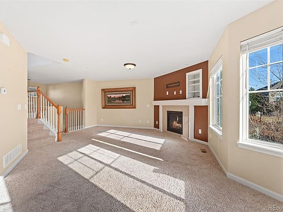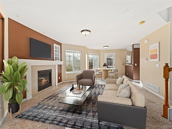 Nestled in the highly desirable Ridgeview Eagle Bend community, this bright and sunny townhome offers a serene and welcoming retreat. The neighborhood is exceptionally quiet and clean, with lush landscaping that feels like living in a park, featuring evergreen trees, bushes, and picturesque bike trails. Friendly neighbors and award-winning Cherry Creek schools, including Grandview High School, make this an ideal place to call home. Inside, the open floor plan is cheerful and inviting. The living room, dining nook, and eat-in kitchen flow seamlessly together, highlighted by a cozy gas fireplace. A spacious kitchen boasts warm wood cabinetry, a pantry, and versatile seating with a breakfast bar and eat-in nook. The dining area opens to a large deck, perfect for outdoor dining or relaxation. Upstairs, the primary bedroom is a tranquil retreat with a bay window, a full en-suite bath accessed through a sliding barn door, and a generous walk-in closet. An additional bedroom and an unfinished basement with an egress window provide extra storage or an opportunity to customize the space. Laundry is conveniently located in the basement. Recent updates include a new roof in 2024 and fresh paint two years ago. Enjoy the community amenities, including a pool and clubhouse. Conveniently located near Saddle Rock Golf Club, E470, Southlands Shopping Mall, and a variety of restaurants, with a Super Target just across the road, this move-in-ready gem has it all.