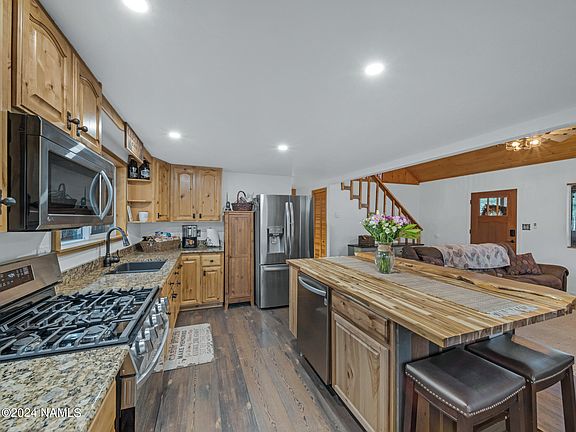 Recently renovated cabin located on a lush 1.07-acre lot surrounded by dense trees, BACKING FOREST SERVICE, in the sought-after SHERWOOD FOREST neighborhood! This charming 2-bedroom, 1-bath home boasts a wrap-around deck to enjoy the serene forest views. With vaulted tongue-and-groove ceilings, a wood fireplace, and a spacious loft overlooking the great room, the home offers a cozy retreat. The kitchen features stunning granite countertops, knotty pine cabinets, and panoramic views of the beautiful ponderosa pine trees. The main level includes a master bedroom with an updated full bath and a renovated tub/shower surround. Additionally, the property includes a 2-car detached garage for all your storage needs. This home is perfect as a primary residence, vacation home, or a VRBO rental, Close to Williams, Flagstaff, the grand canyon, hiking, fishing, hunting, trail riding, and so much more!!