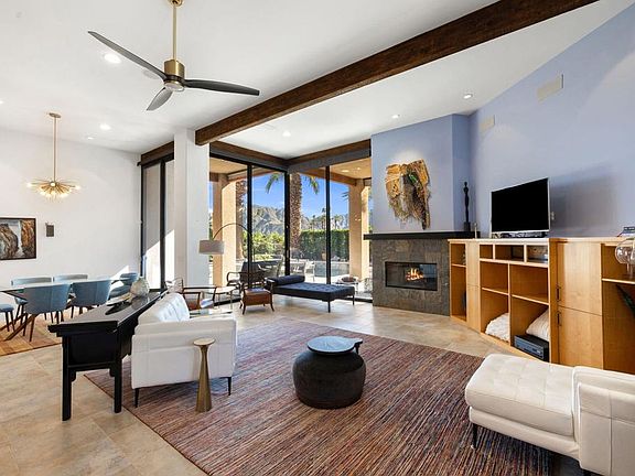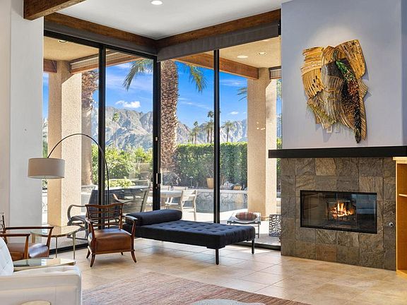 Indulge in opulence with this exquisite Indian Wells home. Fabulous mountain views grace the living room, kitchen, and three bedrooms, complimented by a cozy room ideal for guests, closed-door office space, or private retreat. All three bedrooms have slider doors to the gorgeous and professionally landscaped yard and outdoor paradise featuring a welcoming private pool, a built-in grill, fire pit, & massive indoor/outdoor shades to enjoy the perfect blend of comfort and sunshine. Chef's delightfully designed kitchen accompanies kitchen bar seating. Indoor & Outdoor dining areas with fantastic pool and mountain views. Three zone-heating and cooling provide personalized comfort. Professional artwork lighting and high-end, built-in speaker system throughout the home and backyard are a few of many outstanding features. The expansive main suite retreat offers a lavish escape on the opposite wing, featuring recently installed carpet and professional paint. A massive walk-in closet, relaxing bathtub, and dual shower-heads offer a spa experience.This home boasts eco-conscious features, including fully paid solar panels and, wiring to charge an electric vehicle in spacious 2 car garage which accommodates golf cart & workshop. Residents benefit from many Indian Wells City perks (see attached perks), short distance to dining and shopping.