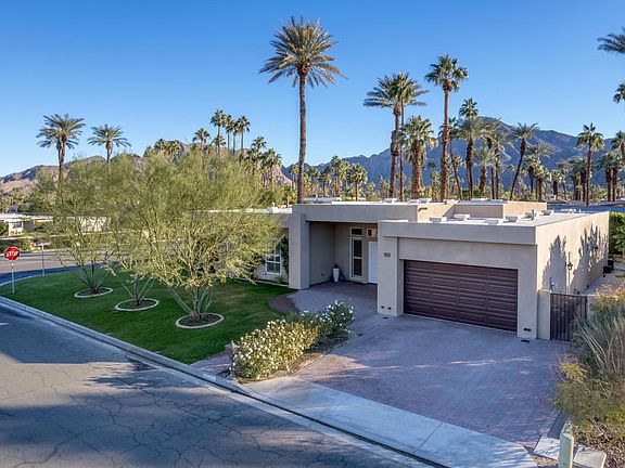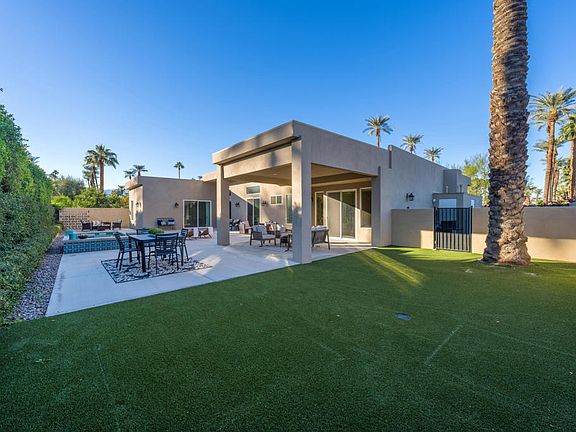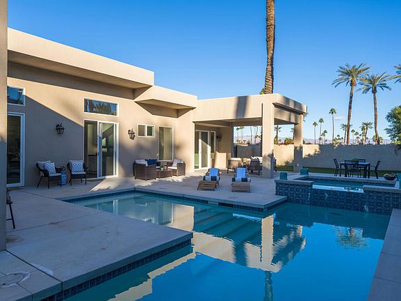 Corner lot home is now available located south of Hwy 111 in non gated Indian Wells. Contemporary residence rebuilt in 2018 with charm + sophistication and NO HOA. You will enjoy grand open floor plan, 12 foot high ceilings. and oversize sliding glass doors that brings ample of natural lights. A 2900+ square foot of living space includes TWO Primary Bedrooms 3 baths and lots of privacy. You will make a statement no matter what the occasion in this Chef's kitchen with champagne custom cabinetry, large granite center island, walk in pantry and stainless steel Thermador appliances package includes fridge, double oven, gas stove, wall hood, dishwasher, microwave and wine cooler! Master suite sunny and spacious with luxurious bath provides double vanity, walk in shower, spa tub and custom built walk in closet. Porcelain wood like tile, recess lighting, plantation shutters and plenty of storage throughout. Low maintenance backyard with covered stucco patio, pool & spa and staggering southern mountain views! As a resident of Indian Wells, you take advantage of restaurant and sport activity discounts as seen in the City's website. Call to schedule your private showing!!