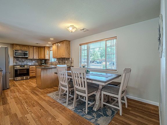 In the desired North area of Grand Junction come see this charming and beautiful home! Located just a short drive from town, this home offers suburban vibes, yet is still close enough for convenience sake. The first thing you’ll notice about this home is the nicely landscaped front yard, with trees, flowers and mature shrubbery ready to greet you. Step inside and behold the clean and open space with hardwood flooring and a fresh coat of paint. The step down living area comes complete with accent molding, a charcoal grey brick fireplace with a large mantle that compliments the room perfectly, and easy access to the back patio via sliding glass door. Not to mention the bright natural light that comes through and illuminates the space. The kitchen and dining area have good flow, and a vibrant and contemporary feel. The kitchen features beautiful tile backsplash, lots of cabinet and counter space and stainless steel appliances. Down the hall from the main living space are the primary suite, two additional well portioned bedrooms, and an additional full bathroom. The primary suite includes a good amount of closet space, and a full en-suite bathroom. The attached garage is very versatile and ready to be used as a home gym, additional workspace, or just parking for your vehicles and/or toys. Out back you’ll love the open patio space and beautiful landscaping all around you! The space includes a built-in fire pit to enjoy a cozy evening star gazing. The yard is fully fenced with private picket, and rot iron, bringing an aura of privacy and elegance. You’ll most definitely be impressed with the extra large added shop/garage space. It offers primary and or additional parking, space to start some projects or hobbies and includes 220 and 50 amp outlets. The home’s exterior also features additional RV parking for the outdoor enthusiast inside you. Don’t let this opportunity to own your dream home slip away. Schedule a showing today.