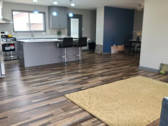 Newly remodeled, open concept 4 bedroom 2 bath, featuring a large living room with 10' picture window, interior custom painting, grey doors and trim package, 42 cabinets, quartz countertops with undermount stainless sink. Dining room with elegant lighting. Stylish floating vanities in both bathrooms, with new showers and toilets. New large deck and fenced yard. This house is ready for a new family, conveniently located to schools, trails, and shopping.