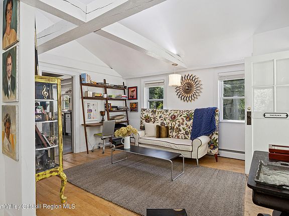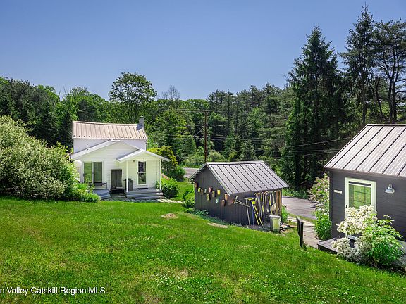 Nestled in the sweet hamlet of Accord, NY, this charming farmhouse built in 1900 is set on 2 acres of perfectly balanced woodland and beautifully landscaped grounds, offering a serene haven. As you enter through the front door, you are greeted by a living room with vaulted and beamed ceilings that create an airy, open feel. Just off the living room, a cozy nook with sliding glass doors offers a perfect spot for relaxation, providing a flood of natural light and a picturesque view of the private deck and greenery outside. This inviting space is perfect for unwinding with a good book or enjoying your morning coffee while soaking in the beauty of the surrounding nature. The living room flows seamlessly into the meticulously renovated kitchen with top of the line appliances and stylish finishes, making it a chef's dream. Adjacent to the kitchen, the dining room provides an intimate setting for meals and entertaining guests. The main floor also features a convenient full bathroom, thoughtfully designed with modern fixtures while preserving the home's historic essence. Upstairs, the primary ensuite bedroom is a peaceful retreat. The beautifully renovated primary bathroom doubles as a luxurious wet room, featuring elegant tilework for a spa-like experience. Cozy yet versatile, the second bedroom of this charming home offers flexibility as a serene space with room for a twin bed or as an ideal home office. Outside, the property is a true sanctuary. Mature landscaping, including tall evergreens and native grasses, forms a natural wall of privacy, while vibrant flowers and flowering bushes provide a seasonal display of color and fragrance. A large portion of the acreage is wooded, offering a buffer from neighbors and the potential for future expansion. Adding to the property's allure is a large, separate studio with its own bathroom and kitchenette. This versatile space is ideal for an artist's retreat, a home office, or additional guest accommodations. A Generac generator ensures uninterrupted comfort, operating both the home and studio. Additionally, a newer metal roof provides durability and peace of mind for years to come. The property is conveniently located to stores, dining, and entertainment in Stone Ridge, High Falls, Rosendale, and Kerhonkson and it's a short drive to Tetta's for provisions.