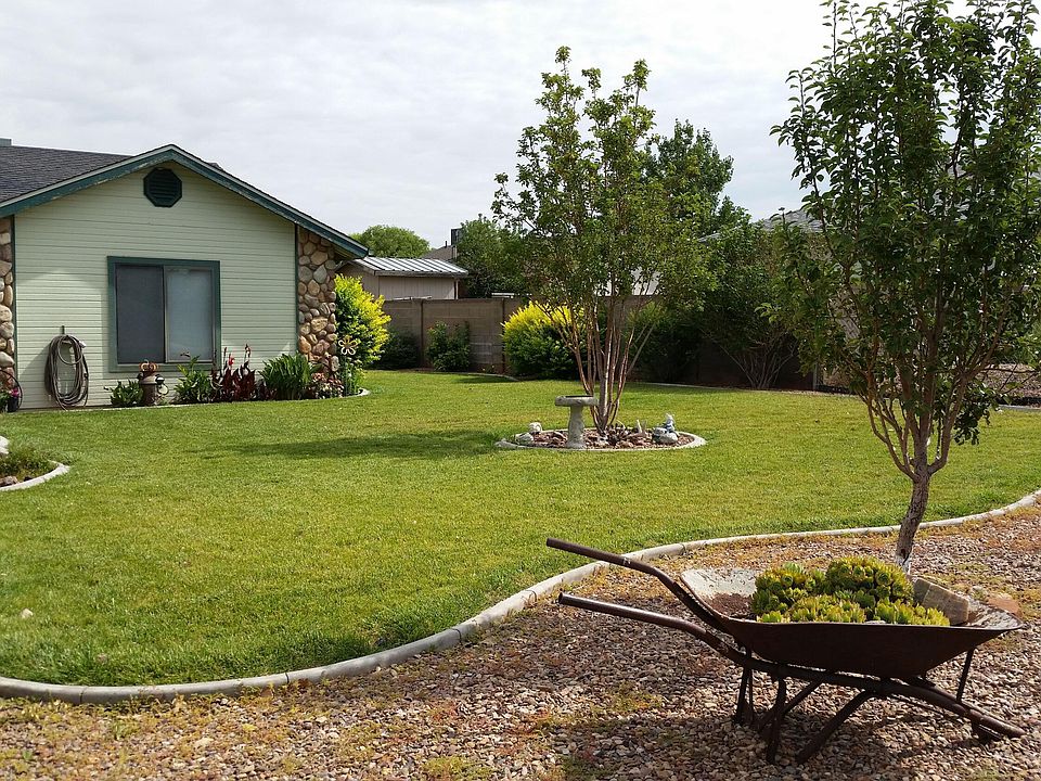 Delightful home with stone accents in an excellent neighborhood! Three bedroom, two bath home with a split floor plan and vaulted ceiling in the open living area. Natural gas and electric HVAC system, The lot is almost a third of an acre, with a block wall around the back and chain link fencing for cross-fencing. There's a large covered patio in back, a separately fenced area for either garden space or a dog run on the west side, a storage shed in back, and a roomy two car garage. Landscaping includes lush grass with sprinklers. There are also numerous trees (both shade and mature fruit trees, including 2 peach, 2 cherry, and 2 pear), shrubs, flowering bushes (including 50 rosebushes), and grapevines. Great property will provide peaceful, comfortable living for years to come!
