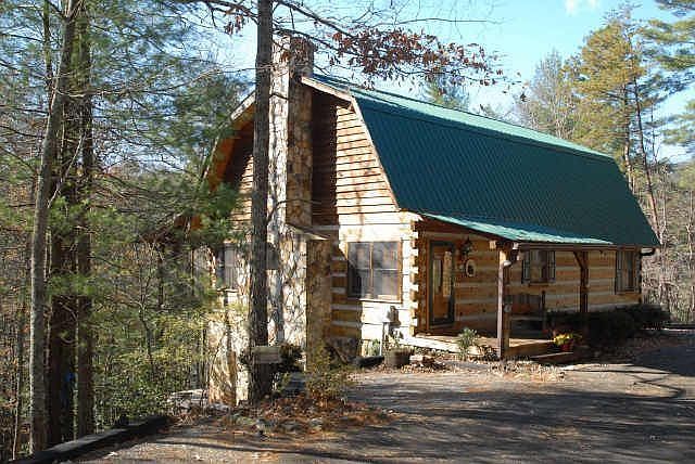 CARTECAY RIVER ACCESS! Just listed vintage chink log 3+/3.5 on beautiful wooded lot in premier, gated Blackberry Mountain. High above flood plain, this awesome property has its own deck over-looking the rapids of the fast flowing, trout rich Cartecay. Highly vaulted ceiling T&G great room w/exposed beams, b'ful wood floors, soaring stone fireplace. Open to dining, equipped kitchen. Finished terrace level. Classic metal roof. $297,900