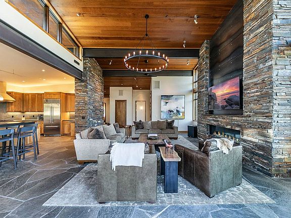 Step inside and be immediately wowed by the soaring vaulted ceilings, rich split-face slate walls, and a majestic fireplace that sets the tone for cozy elegance. Stone floors throughout the main living areas exude timeless beauty, while every detail of the home, from the high-end furnishings to the custom design elements, ensures a lavish yet welcoming ambiance. The main living area is spectacular, with exposed wood beams, a stunning grand chandelier, and ceiling fans that complement the spacious, open floor plan. Expansive windows frame breathtaking views of the Lahontan landscape, offering glimpses of the golf course and bike/walking paths.