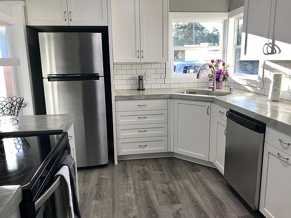 Beautiful Remodeled stucco home on a deep, fenced corner lot in west Redding. Luxury Vinyl Plank flooring, large living room, charming private entry. Separate laundry room. Detached double garage has side street access.