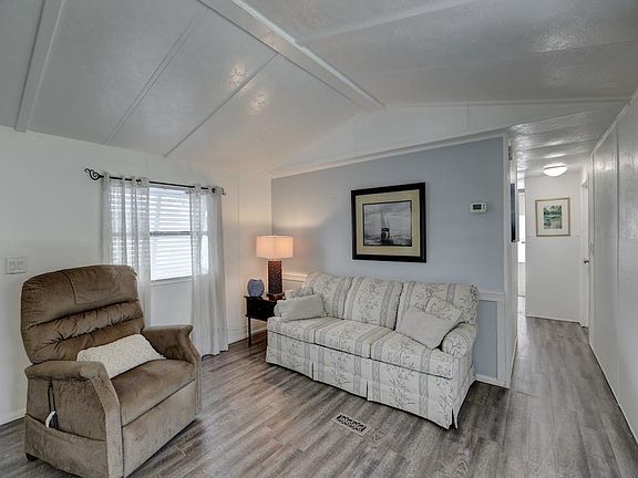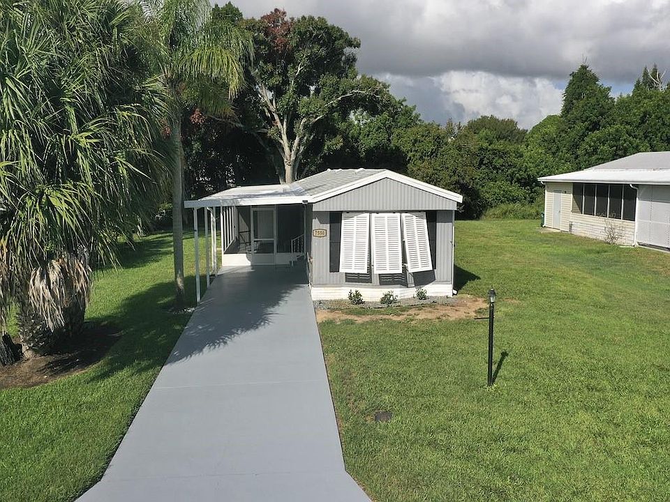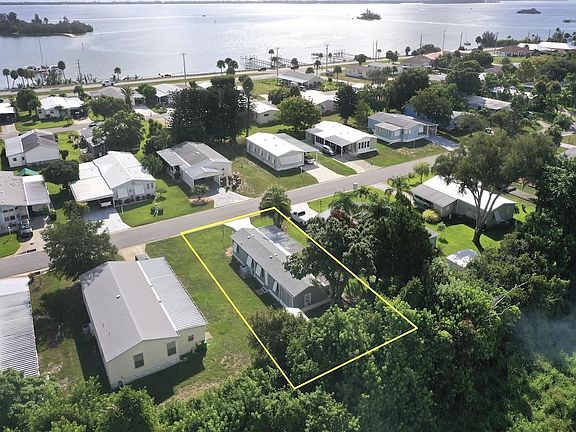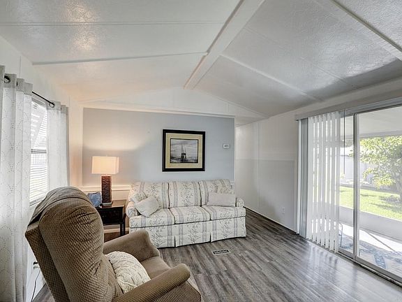 Coastal Cutie! Own your own land in 55+ community, just a short stroll to the river. Two bedrooms plus an area for a desk to catch up on paperwork. Open concept kitchen & living room with sliding glass door leading to enclosed porch & utility room. Roof 2020. Enjoy Florida entertaining on your spacious screened porch. Enormous matching shed to store all your extras. Bonus: the furnishings remain.