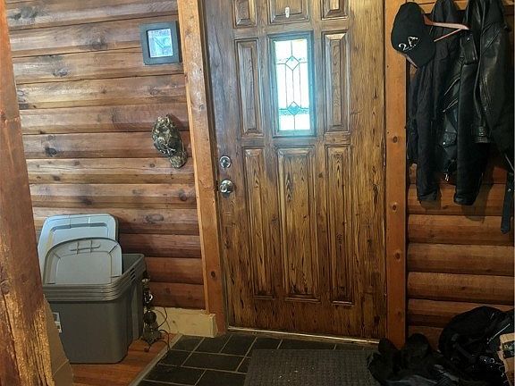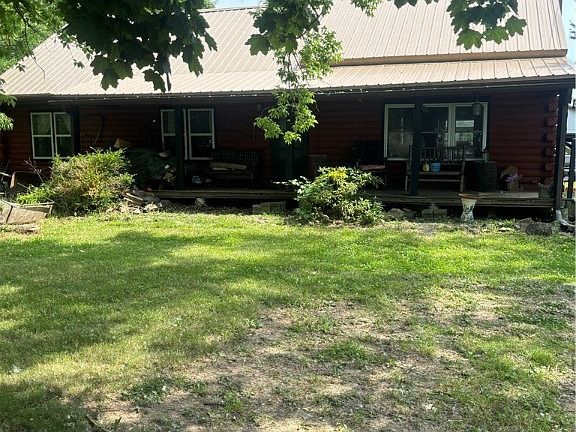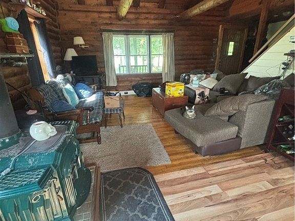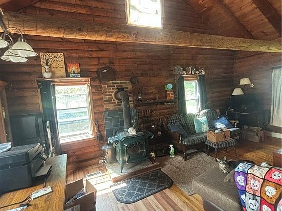 A log home nestled in the trees, but close to everything! 2 bedrooms on the first floor with 2 additional rooms on the second floor that could be finished and used as bedrooms. Wood cathedral ceilings and beams along with Vermont Casting woodstove makes this home extra cozy. Stove (propane), refrigerator, dishwasher, washer and dryer are included. Tankless hot water system. Oversized 2.5 car garage (26x30) with workshop area and 100-amp electric service. Covered front porch along with back deck with Pergola. Two additional sheds for storage. Selling "As-is".