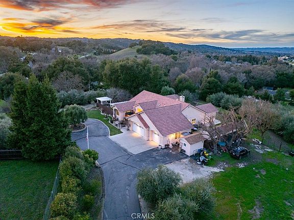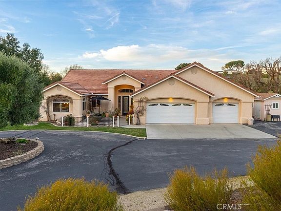 Discover privacy and tranquility in this charming Atascadero home, set on 2 serene acres with beautiful olive trees and inviting outdoor spaces. This 2,604± sq. ft. residence features 3 bedrooms, 2.5 bathrooms, and a well-designed layout offering both comfort and functionality. The welcoming entry leads to a spacious living room with vaulted ceilings, a cozy reading nook, and glass sliding doors that open to the back patio, blending indoor and outdoor living. The well-appointed kitchen includes a large island, dining area, and walk-in pantry, perfect for entertaining or everyday gatherings. The private primary suite offers a walk-in closet and a spa-like bathroom with a sauna, creating the perfect retreat. Additional highlights include a dedicated office, a laundry room, and an attached 3-car garage. Outside, the property boasts a paved and gated driveway, a fenced yard, a separate storage shed, and multiple patio spaces. The covered back patio is ideal for outdoor dining, barbecuing, or relaxing in the hot tub while enjoying the peaceful surroundings. With an owned solar system and a prime location offering both convenience and seclusion, this home is a true Central Coast gem.
