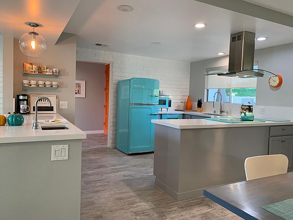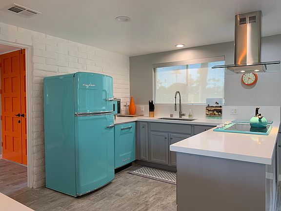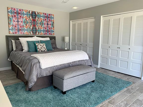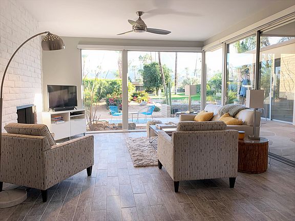 "Mid Mod Mirage". Completely Furnished, corner house with beautiful views of plenty of privacy. Sleeps up to 6 and includes dining for 6+. Large 2 bedrooms (both have Kings), 2 baths with everything new and no details spared. 1 car garage and plenty of street parking. Walls of windows with remote controlled shades for privacy. Enclosed patio plus open back yard with view of lake and Ike Mountains. Quiet gated community with 6 pools and 2 tennis courts. Close to shopping, restaurants, Empire Polo Grounds, and Tennis Garden. Month to Month rental, 1 month + Please inquire about specific dates/months/rent