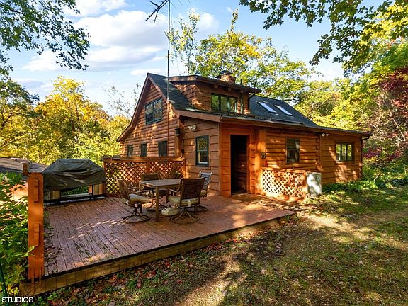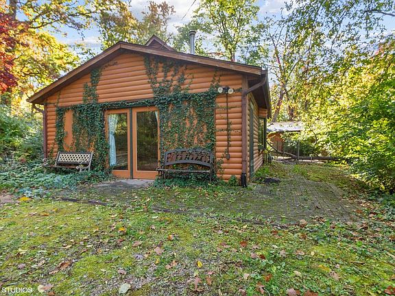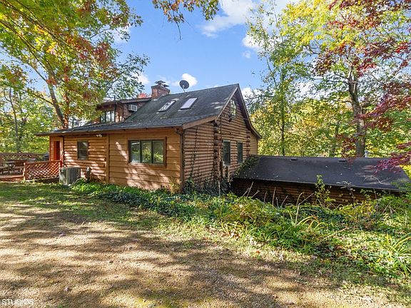 Tranquil, secluded open concept 3+ bedroom LOG HOME on approximately 2 acres Approximately 2300 square feet. 2 stone wood burning fireplaces, 1 gas fireplace in family room. Huge 2 story detached 2 1/2 car garage with heater, storage shed and tree house. Full, finished walk out basement. Tons of light throughout including 8 skylights. Roof and skylights 12 years old, hw tank 4 years old, saltless water softener 5 years old, furnace 16 years old. Well maintained.