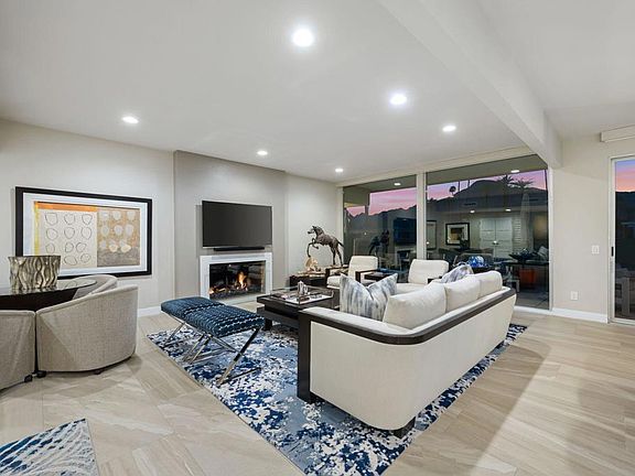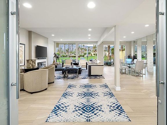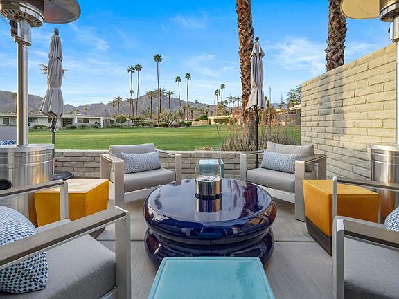South Facing, Midcentury modern condo remodeled & reimagined to perfection with quality finishes throughout. This pristine and move-in ready home has the best location in the popular Casa Dorado community. It faces south with the most breathtaking unobstructed view of the Santa Rosa Mountains and the community pool is within walking distance. The home features an open great room floor plan. 8'x12' ceramic tile in the main living areas. A gourmet chef's kitchen w/ quartz counter tops and GE Monogram stainless steel appliances. There are 3 bedrooms w/ 2 baths. All windows have been replaced to top of the line dual pain windows. The Spacious primary bedroom enjoys the mountain views from the patio and has luxury carpet & attached bath with dual sinks and separate tub. The spacious 2nd bedroom is set up as an office but has closets and can be a 2nd Primary bedroom. There is a 3rd bedroom next to the office with it's own bath . All baths have quartz counter tops and have been tastefully updated. The Living room opens to a large back patio enjoying the unbelievable views and is perfect for desert indoor / outdoor living and entertaining. Owners have added a large laundry room and attached golf cart garage. The property is being offered furnished with an exclusion list .Casa Dorado is a low density community with 4 tennis courts , several community pools and 3 pitch and putt golf holes. There is a clubhouse where neighbors hold several gatherings a year.